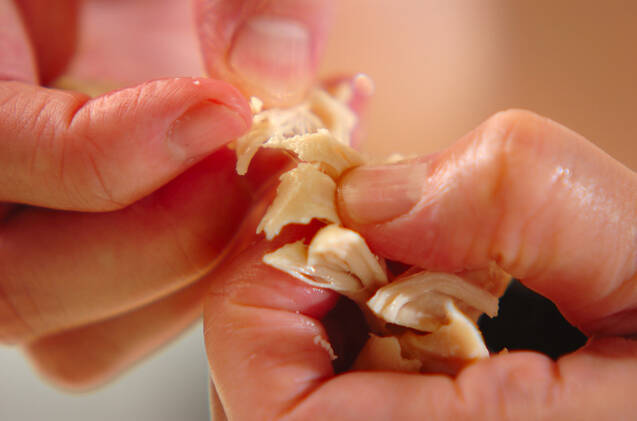 鶏ささ身は筋を引いて耐熱容器に並べ、酒をかける。塩をしてふんわりラップをかけ、電子レンジで2~3分加熱し、粗熱が取れたら食べやすい大きさに裂く。
