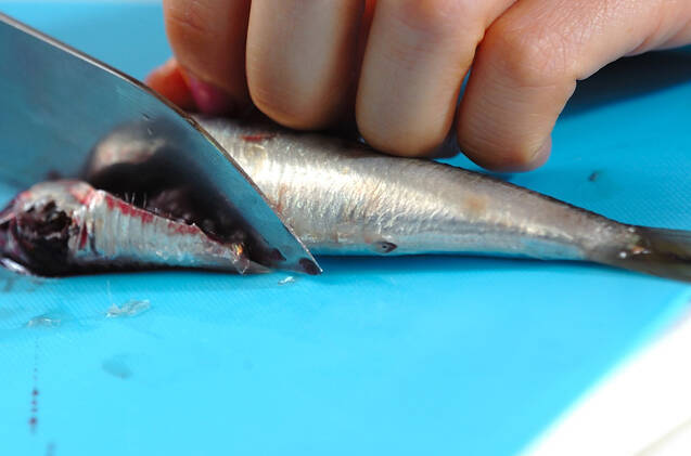 イワシはウロコを取って頭を落とし、腹を斜めに切る。ワタを出して分量外の塩水で洗う。親指の腹を骨に添わせ、頭側から尾に向かって滑らせるように身をはがし、尾の付け根で骨を折り、身を押さえながら骨を頭に向かってはがすように取る。腹側に小骨がある場合は削ぎ落とし、両面に塩コショウを振る。
