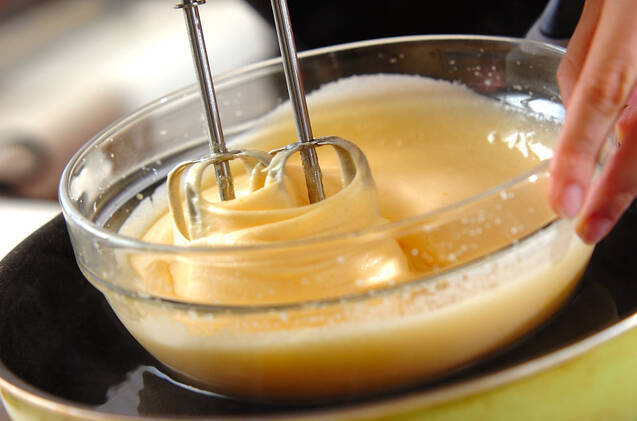 別のボウルに卵とグラニュー糖、塩を入れ、湯煎にあてながら白くもったりしてくるまでハンドミキサーで混ぜ、(1)を加えて混ぜ合わせる。