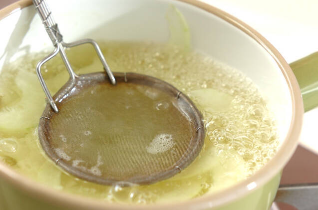 鍋にだし汁、白ウリを入れて強火にかける。煮たったら火を弱め、白ウリが半透明になり、しんなりするまでアクを取りながら約7~8分煮る。