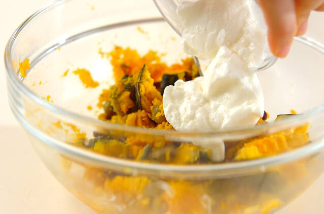 ボウルにカボチャを入れ、ザックリつぶすように混ぜ合わせる。さらにその他の材料を入れて混ぜ合わせ、器に盛る。