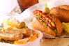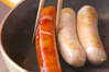 <焼きソーセージ>を作る。フライパンにサラダ油を薄くひき中火にかけ、ソーセージに焼き色がつくまで焼き、キッチンペーパーにのせ油を切る。ソーセージが長い場合は半分に切る。