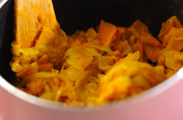 鍋にバターを弱火で熱し、玉ネギをしんなりするまで炒め、半透明になったらカボチャ、塩ひとつまみを加えてさらに炒める。カボチャが煮崩れるくらいしっかり炒めたら、水(カボチャがヒタヒタになる位の量)を加え、2~3分煮る。
