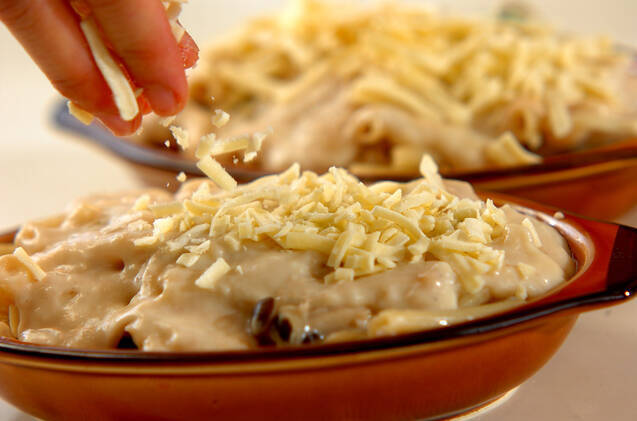 <ホワイトソース>の半量と(3)の炒め物、(4)のマカロニとブロッコリー、ウズラの卵を混ぜ合わせる。バターをぬった耐熱容器に盛り分け、残りの<ホワイトソース>をかけてピザ用チーズを全体にのせる。 250℃に予熱しておいたオーブンに入れ、おいしそうな焼き色がつくまで15分程焼き、ドライパセリを振る。