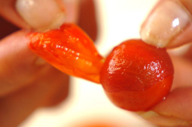 プチトマトはヘタを取り、熱湯につけて皮が少し破れたらすぐに冷水に取り、皮をむく(湯むき)。