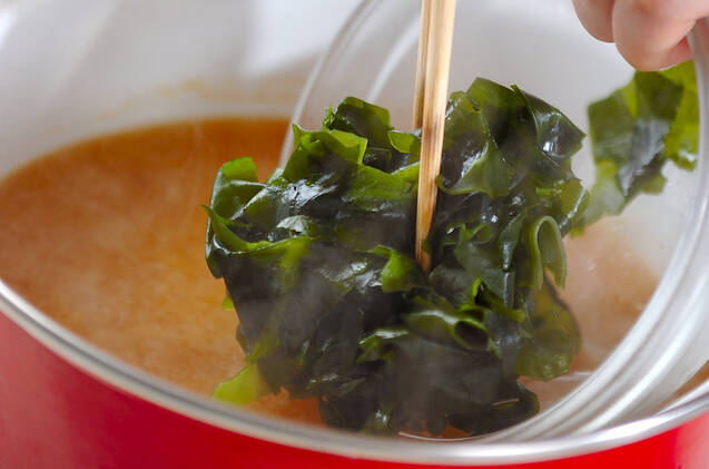 2~3分煮てみそを溶き入れ、ワカメ、板麩、刻みネギを加えて火を止め、器に注ぐ。