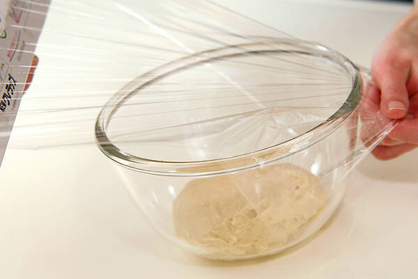 表面を丸くまとめ、閉じ目を下にしてボウルに入れ、ラップをして生地が2~2.5倍にふくれるまで一次発酵させる。(30℃、25~40分)