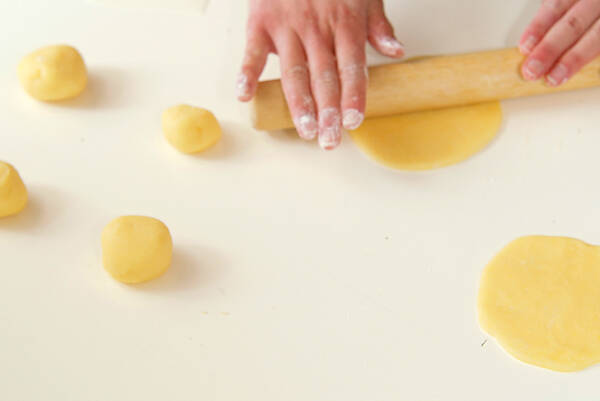 ベンチタイムの間に、上にかぶせるビスケ生地の準備をしておく。冷蔵庫からビスケ生地を出し、6分割する。直径8cmくらい(生地の発酵による)に丸く伸ばす。成形の間も生地が乾かないように、ぬれ布巾をかぶせておく。