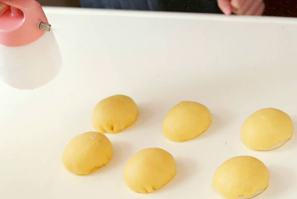 ビスケ生地の上から霧を吹いてグラニュー糖をまぶしつけ、オーブンシートをひいた天板に置く。