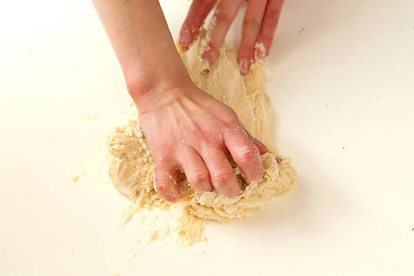 まとまったら、カードで台の上に出し、少しこねて粉気をなくす。