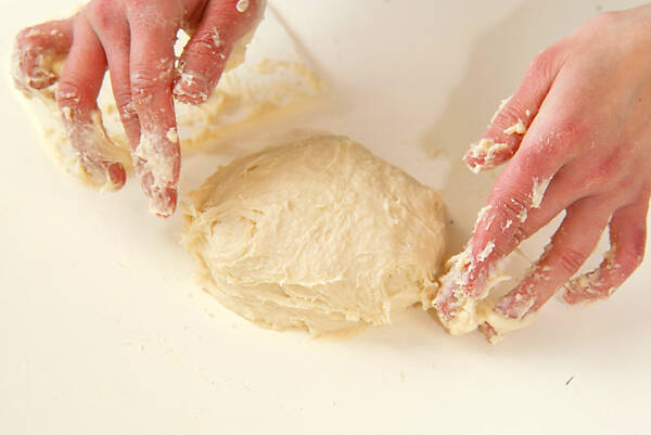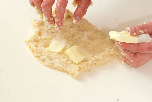 バターを細かくちぎって生地の上に置き、擦り込むようにこねる。(最初は手の平の部分を使ってこねると油分が生地に入っていきやすい)生地がまとまってきたらこね終わり。(少し柔らかめの生地です)