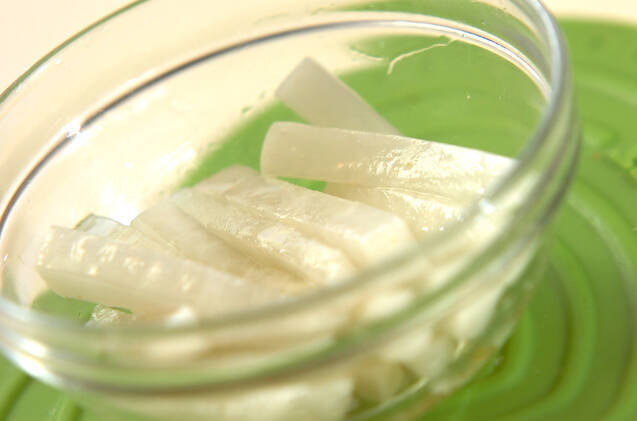 大根は皮をむいて、1cm角の棒状に切る。塩をもみ込み、水分がでてきたら、水気を絞って<調味料>の材料に漬ける。