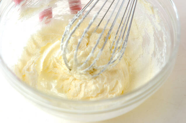 ボウルに無塩バターとショートニングを合わせて練り、グラニュー糖を加えて白っぽくなるまで泡立て器でよく混ぜる。