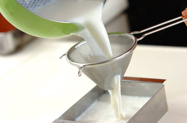 網でこしながら、水を通したバットなどに流し入れ、冷蔵庫で冷やし固める。(ヒント)調理時間に冷やし固める時間は含まれていません。
