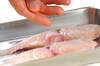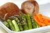 グリーンアスパラは根元のかたい部分を切り落とし、ハカマを取り除いて長さ4cmに切る。ニンジンは皮をむき、幅1cmの拍子木切りにする。シイタケは軸を切り落とす。