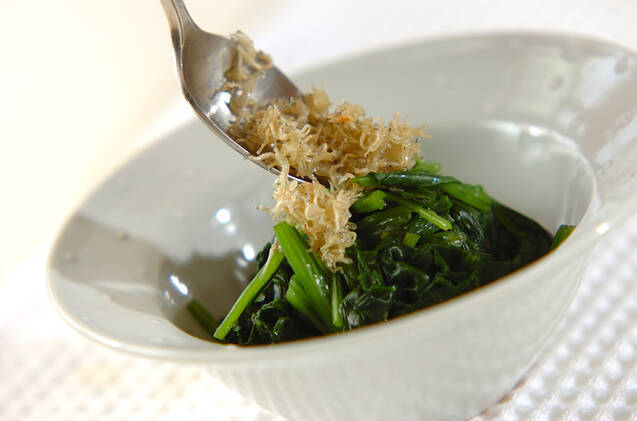 フライパンにゴマ油、チリメンジャコを入れてカリッと炒め、(1)のホウレン草にのせる。