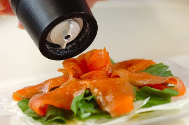 (1)にミルびき岩塩を振り、オリーブ油、レモン汁をかけ、マヨネーズを細く絞る。