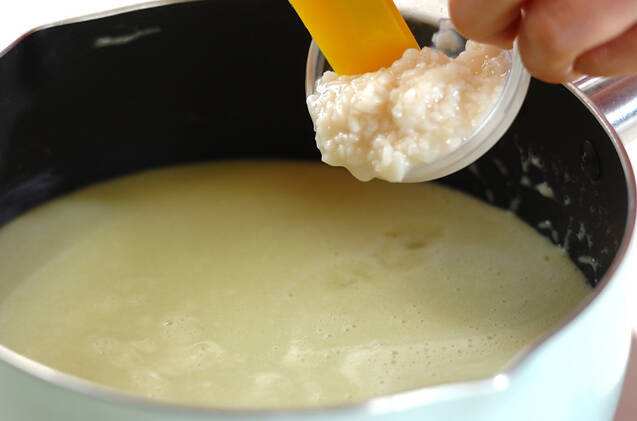 (2)に牛乳を加え、ミキサーに入れてかくはんし、網に通して鍋に戻し入れる。再び火にかけ、煮たったら塩麹と塩で味を調える。器に注ぎ入れ、ドライパセリを振る。