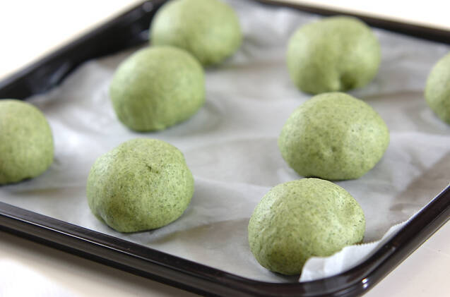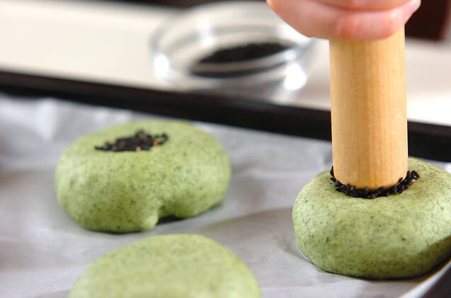 生地が約2倍に膨らんだら、生地の上にオーブンシートをのせて天板を重ね、天板で挟む様にして生地を平にする。麺棒等の先を少し水でぬらして黒ゴマをつけ、生地の中心に黒ゴマをつける。