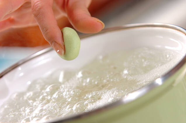 二色の白玉団子を8個ずつに丸め、少し中央をへこませながら熱湯に入れ、浮いてきたらそのまま1分ゆで、冷水に取る。