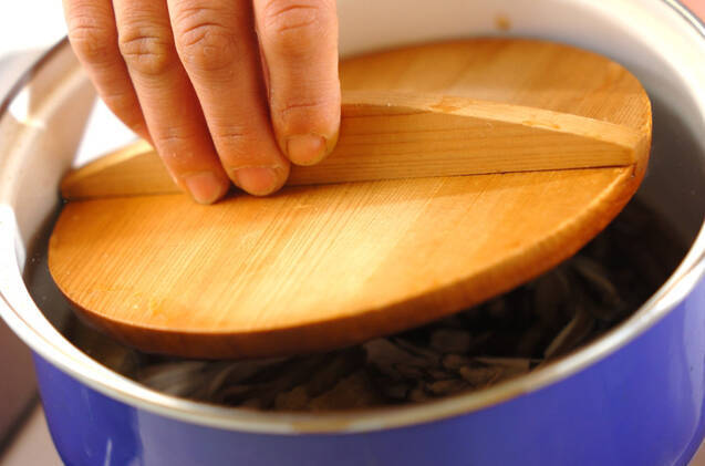 煮たったら水煮ゼンマイ、油揚げ、マイタケを加え、落とし蓋をして3~4分中火で煮、器に盛る。