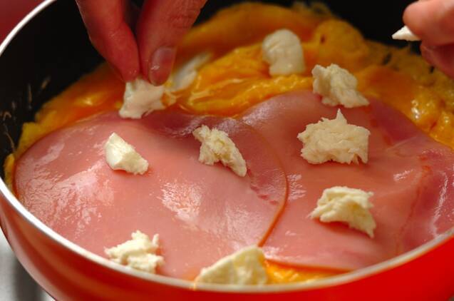 ハム2枚をのせ、モッツァレラチーズの半量をちぎって散らし、フライパンに蓋をして30秒温めて皿に移す。
