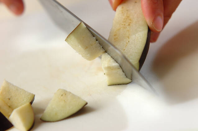 ナスはヘタを切り落とし、小さめのひとくち大の乱切りにする。ツナはザルに上げ、油をきる。