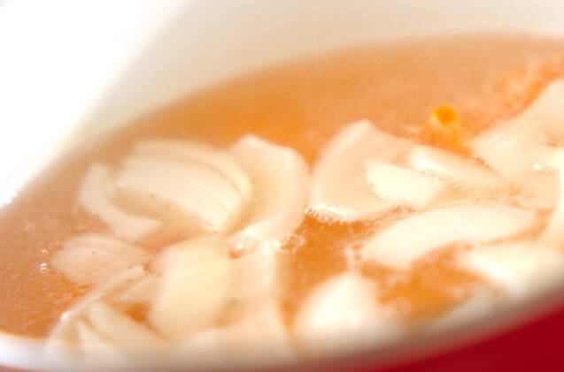 鍋にだし汁、玉ネギ、ニンジンを入れて強火にかけ、玉ネギが透き通るまで煮る。