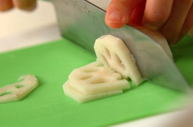 レンコンは皮をむき、厚さ5mmの半月切りにする。分量外の酢水に放って5~6分置き、ザルに上げて水気をきる。