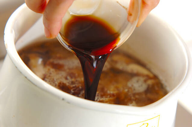 <つけつゆ>を作る。鍋にシイタケ、シイタケのもどし汁、水を加えて強火にかけ、煮たったらかつお節を加える。再び煮たったら、弱火にして3~4分煮、酒、みりん、しょうゆ、塩を加え、さらに弱火のまま2~3分煮て、キッチンペーパー等でこす。