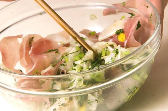 ユズの皮は薄く削ぎ、裏の白い部分を取りサッと水洗いする。1にオリーブ油、ユズ皮、しょうゆを加えて混ぜ、生ハムを加えてさっくり混ぜ合わせる。