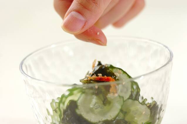 (2)を器に盛り、白ゴマを指先でひねるようにつぶしながらかける。