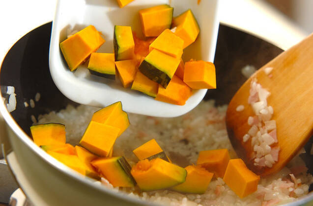 お米が半透明になったら白ワインを加え、強火で水気を飛ばすように手早く炒め、カボチャを加えてさらに炒め合わせる。