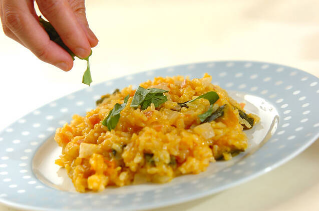 最後に粉チーズを加え、全体に混ぜ合わせる。塩コショウで味を調えて器に盛り、ちぎったバジルを散らす。