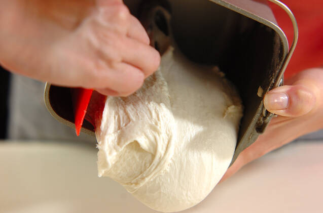 塩を入れ、パンケースを本体にセットする。水を粉の周りに注ぎ入れ、本体の蓋を閉める。天然酵母メニュー食パンの一次発酵までの「パン生地を作る」のスイッチを入れる(約4時間)。