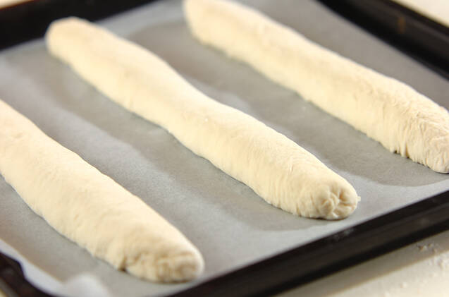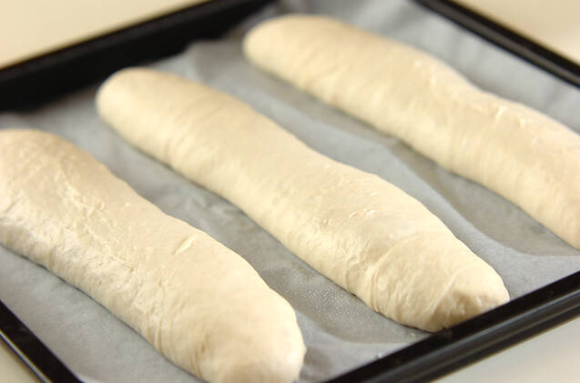 閉じ目を下にし、オーブンペーパーを敷いた天板に並べる。霧吹きをして、オーブンの発酵機能を使って1.5倍くらいになるまで約40~60分くらい二次発酵する(30℃くらいの室温で発酵させてもOK)。