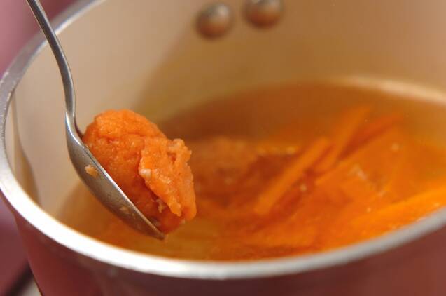 鍋にだし汁とニンジンを入れて中火で熱し、煮たったら(1)をスプーンなどで丸めながら落とし入れる。