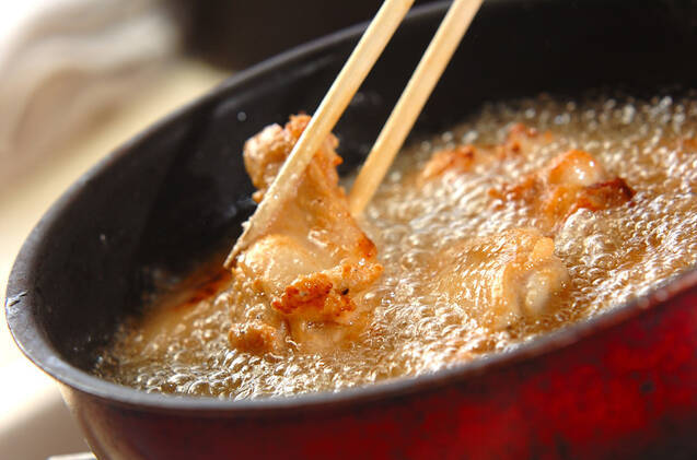 鶏肉を揚げ油に入れ、中火のままでじっくり揚げる。