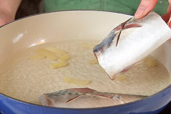 深めのフライパン又は鍋に、<煮汁>、輪切りのショウガを入れて強火にかける。煮立てばサバを加え、鍋の蓋をする。