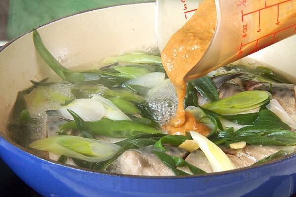再び煮立てば青ネギを加えて中火にし、蓋をして5~6分煮る。全体に火が通ったようならみそを加え、更に5~6分煮る。
