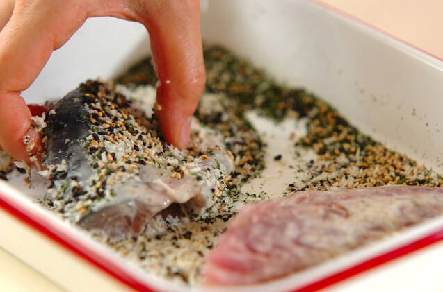 サバに塩コショウをし、<溶き小麦粉>、<ゴマ衣>を順につける。160℃の揚げ油に入れ、おいしそうな揚げ色がつくまで揚げ、油をきる。