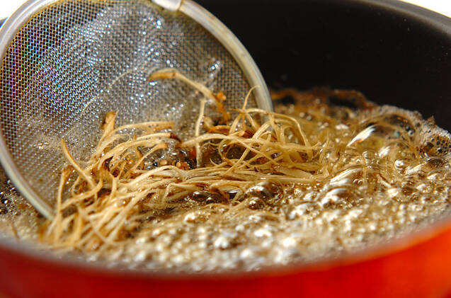 続けてゴボウを揚げ油に加え、パリッとしたら油をきり、塩コショウを振る。