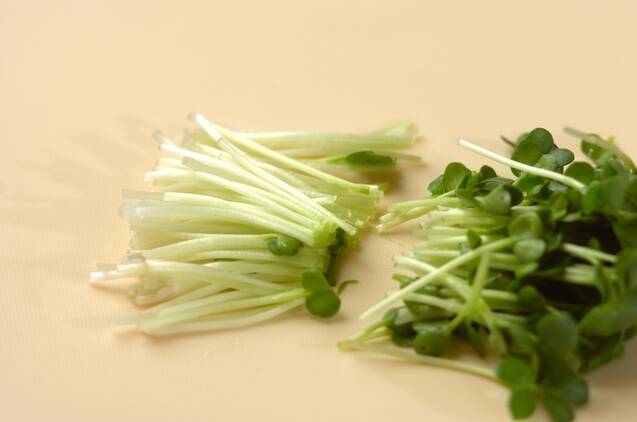 <薬味ソース>の材料を混ぜ合わせる。貝われ菜は根元を切り落とし、長さを2等分に切る。
