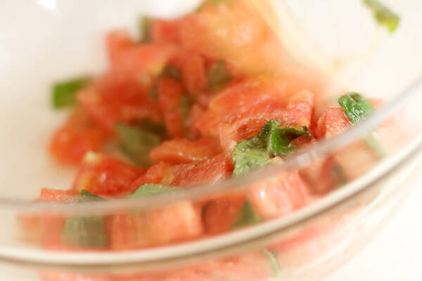 <トマトソース>のバジルの葉はサッと水洗いし水気を拭き取ってちぎり、他の材料とよく混ぜ合わせてラップをかけ冷蔵庫で冷やしておく。
