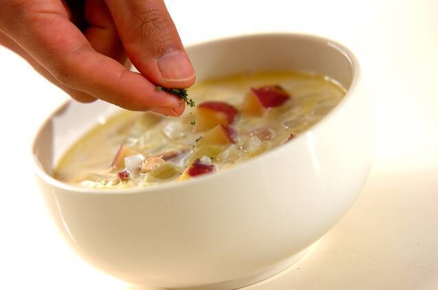牛乳、生クリーム、塩を加え、ひと煮たちしたら器に注ぎ、ドライパセリを振る。