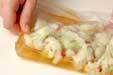 カリフラワーが熱いうちに<合わせ甘酢>につける。