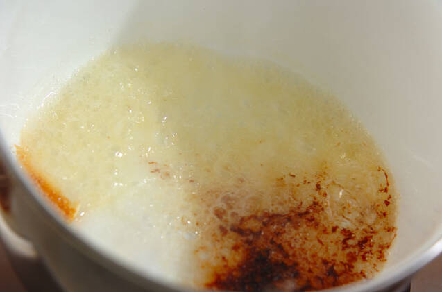 フライパンにバターとグラニュー糖を入れ、中火にかける。カラメル状になるまでフライパンを傾けながら火を入れる。