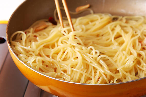 ゆでたてのパスタを【2】のフライパンに加え、塩、粗びき黒コショウで味を調える。サッと炒め合わせたら器に盛る。