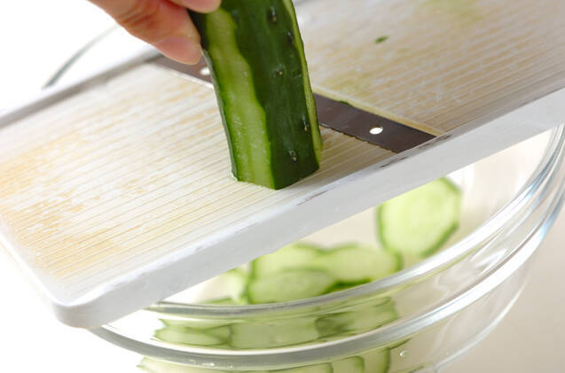 キュウリは縦縞に皮をむいて輪切りにし、塩少々でもんでしんなりしたら水洗いして水気を絞っておく。