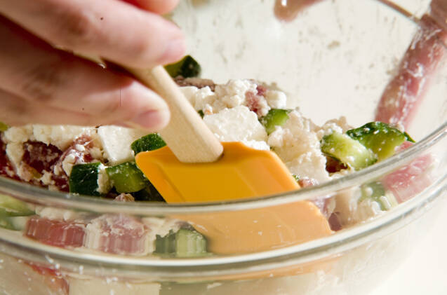 <ドレッシング>を混ぜ合わせ、1/3量に細ネギ以外の材料を混ぜ合わせる。明太子の薄皮に切り込みを入れて中身をしごきだし、残り2/3量の<ドレッシング>と混ぜ合わせ、明太ソースを作る。